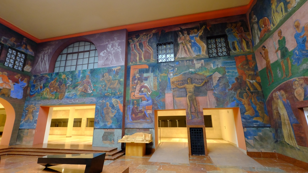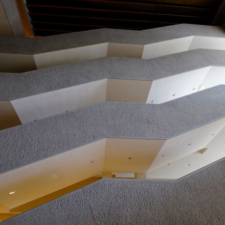 Dann war das große Festspielhaus mit ca. 2200 Sitzplätzen an der Reihe. In diesem Saal gibt es auch eine obere Etage mit Sitzplätzen und Logen an den Seiten. Die Räumlichkeit wurde von dem Architekten Holzmeister in der Form einer Muschel geplant, da es somit die beste Schallübertragung gibt. Zum Schluss durften wir noch einen Blick hinter die Bühne werfen. Diese ist zu den Sitzplätzen hin mit einem mehrere Tonnen schweren eisernen Vorhang getrennt, der im Ernstfall als Brandschutz dient. Die Spielfläche kann in verschiedenen Größen abgetrennt werden und ist daher sehr vielseitig nutzbar.