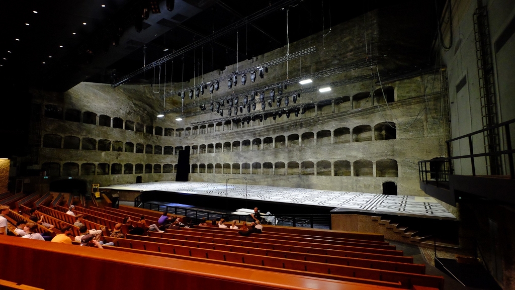 Die Felsenreitschule bietet ca. 1300 Sitzplätze. Bis 2009 war der Saal nur mit einer Plane bedeckt, deshalb konnte er im Winter nicht genutzt werden. Seit 2009 gibt es ein verschiebbares Dach, welches komplett geöffnet werden kann. Um die genauere Konstruktion des Daches sehen zu können, erlaubte uns der Mitarbeiter einen kurzen Blick nach ganz oben.