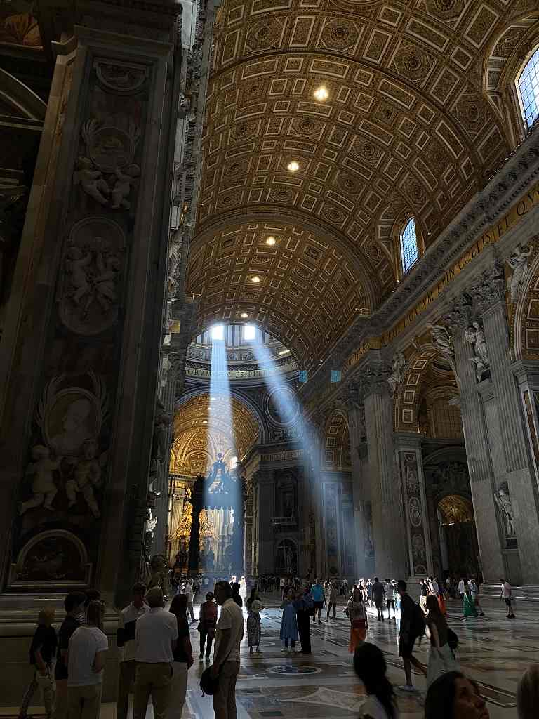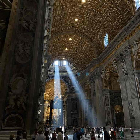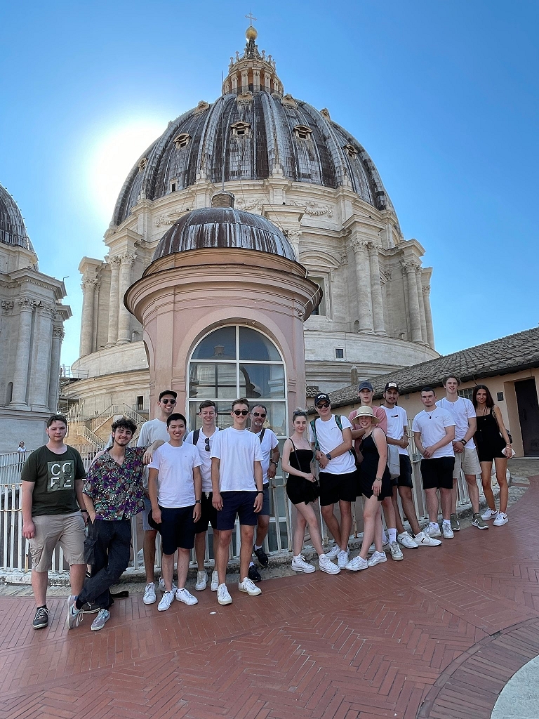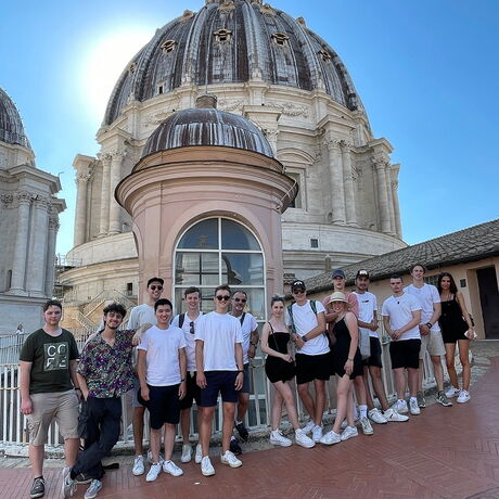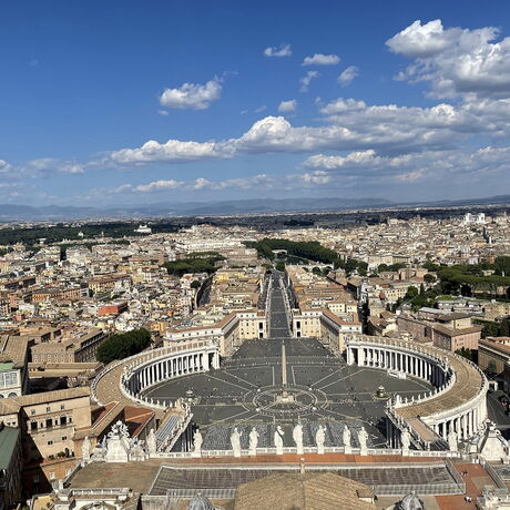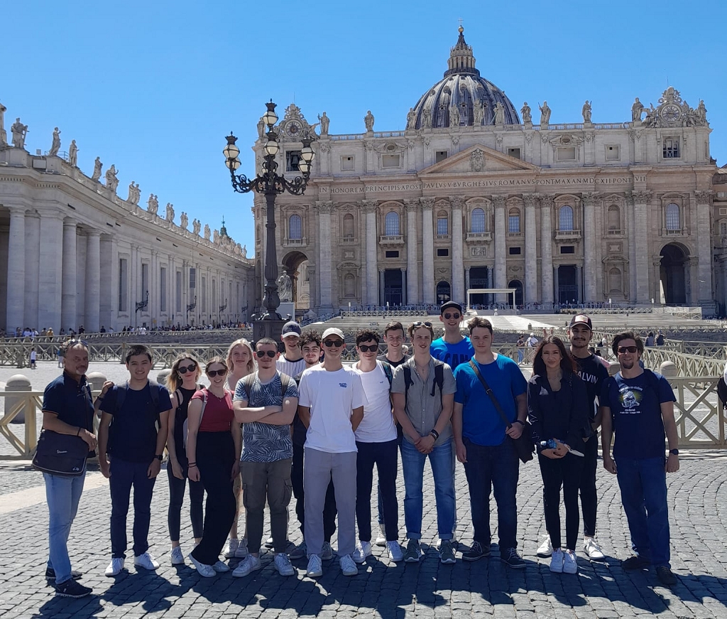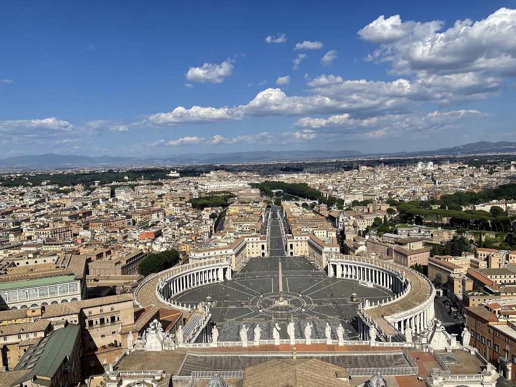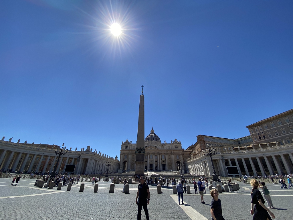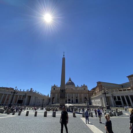 Nach einer unruhigen Nacht im Nightjet erreichten wir mit etwas Verspätung das wunderschöne Rom und sofort begann das Programm für den Tag. Nach einem kurzen Stopp im Hotel ging es für uns bereits wieder in einen neuen Staat, in den Kirchenstaat namens Vatikan. Dort bekamen wir eine Führung der „Scavi di San Pietro“-Ausgrabungen unter dem Petersdom. Diese Führung beinhaltete die Nekropole (Totenstadt) sowie das Petrusgrab. Anschließend besichtigten wir den Petersdom mit seiner imposanten Kuppel.