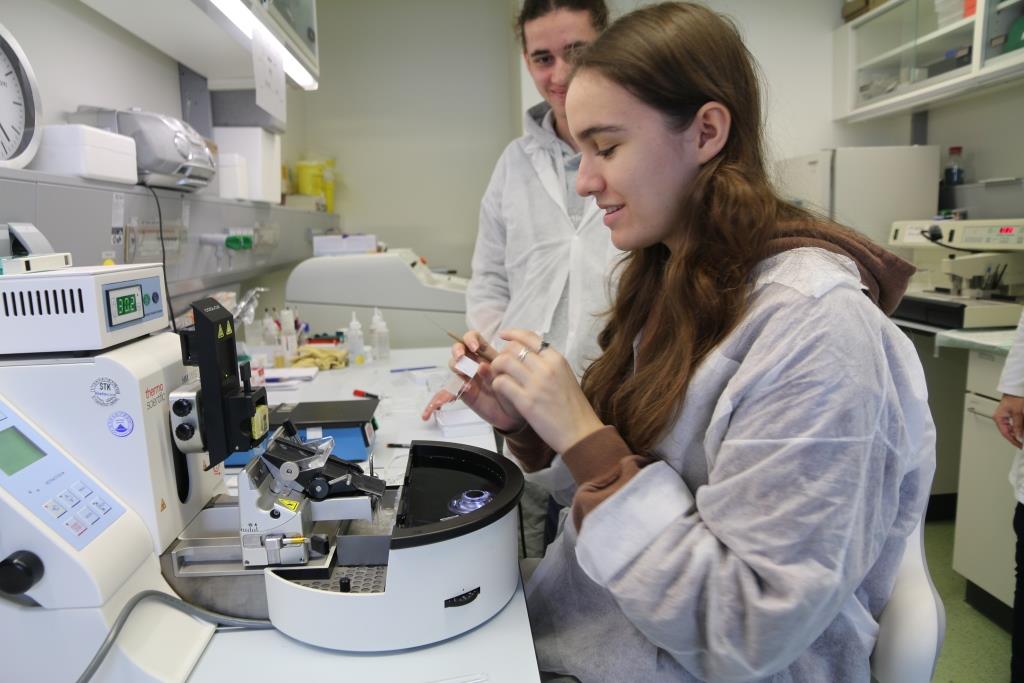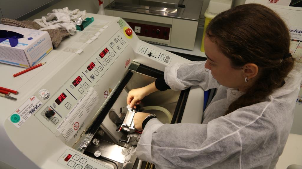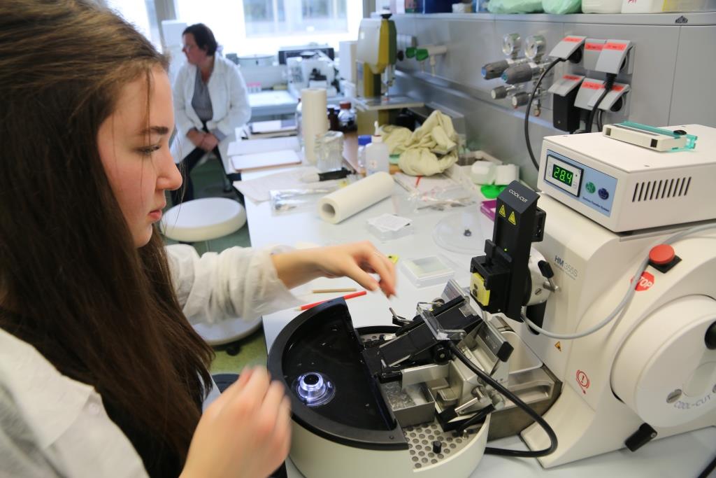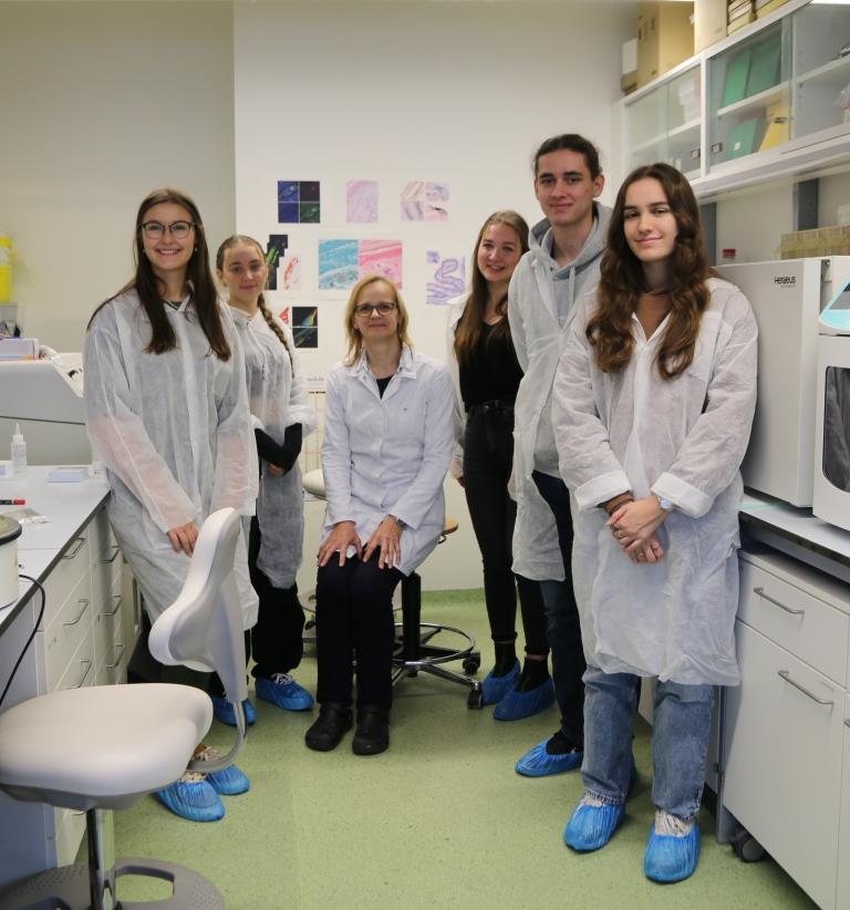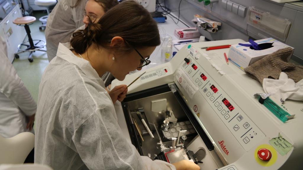 Im Rahmen der Diplomarbeit "Digital Tendon Scoring Tool" in Zusammenarbeit mit der Paracelsus Medizinische Privatuniversität durfte die Projektgruppe der 5AHBG an einem Histologieworkshop in den Laborräumen der Universität teilnehmen. Dabei konnten sie einen Einblick erlangen, wie die Sehnenschnittbilder für die Auswertung durch modernste automatische Analysewerkzeuge entstehen. Angefangen beim Schneiden am Mikrotom über die Färbung der Präparate bis zum Mikroskopieren konnten sie an zwei spannenden Tagen vieles Neues lernen. Das Ziel der Forschung ist die Heilungsmechanismen der Sehnen zu verstehen und dadurch die Entwicklung von neuen Medikamenten zur schnelleren Sehnenheilung nach Verletzungen zu ermöglichen.