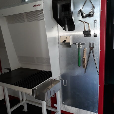 eine Schleifkabine zum Bearbeiten der Arbeitsproben und Werkstücke