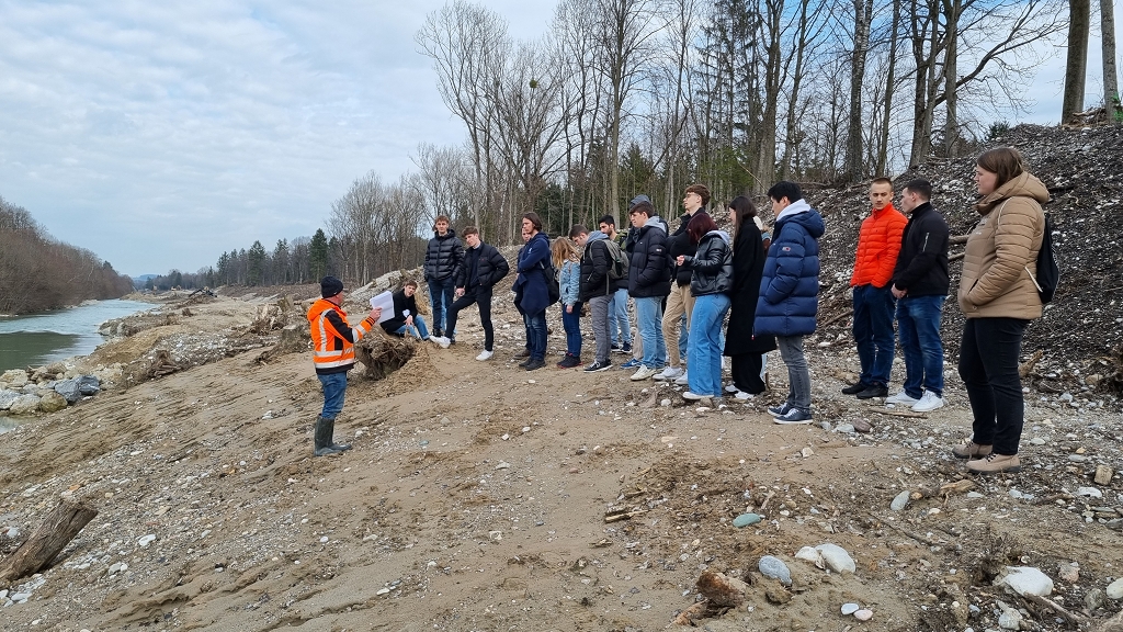 Am Nachmittag besichtigten wir gemeinsam mit der 5. Tiefbau Klasse die Flussbaustelle an der Saalach in Wals-Siezenheim. Die Saalach erhält hier auf 2,1 km Länge ein breiteres Flussbett und einen zusätzlichen Hochwasserschutz. Die Arbeiten werden noch bis voraussichtlich 2024 dauern, wobei sich Fluss und Ufer bis dahin größtenteils selbst gestaltet haben werden.