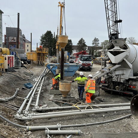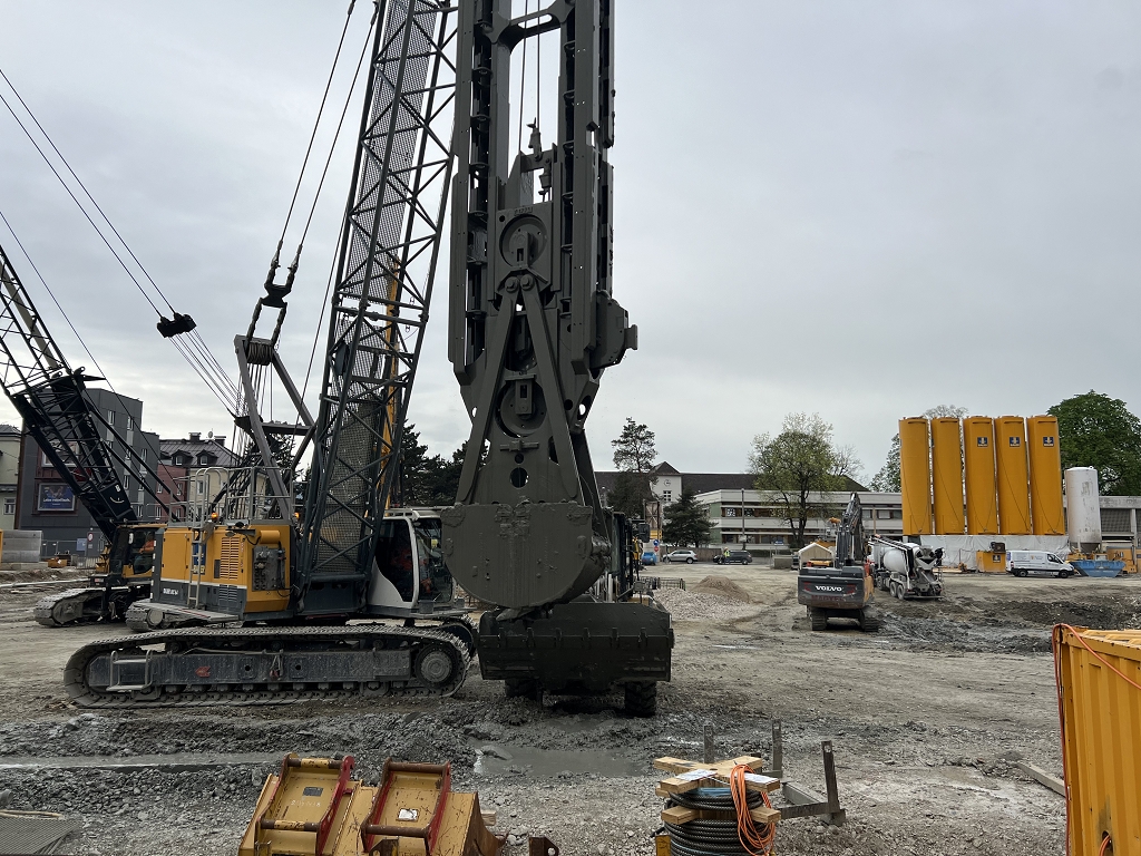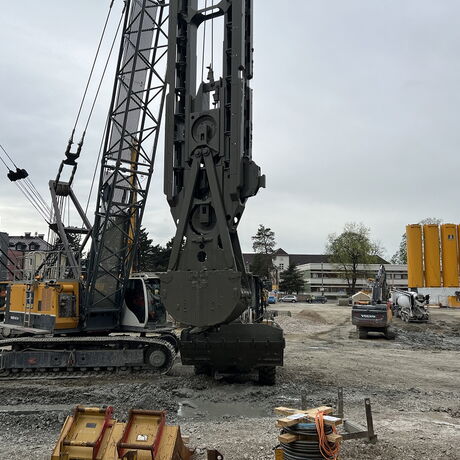 Nach Abschluss der Abbrucharbeiten werden in der momentanen Bauphase rundumlaufende Schlitzwände und zahlreiche Bohrpfähle am Baugrund errichtet.
