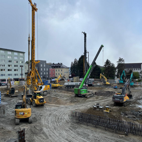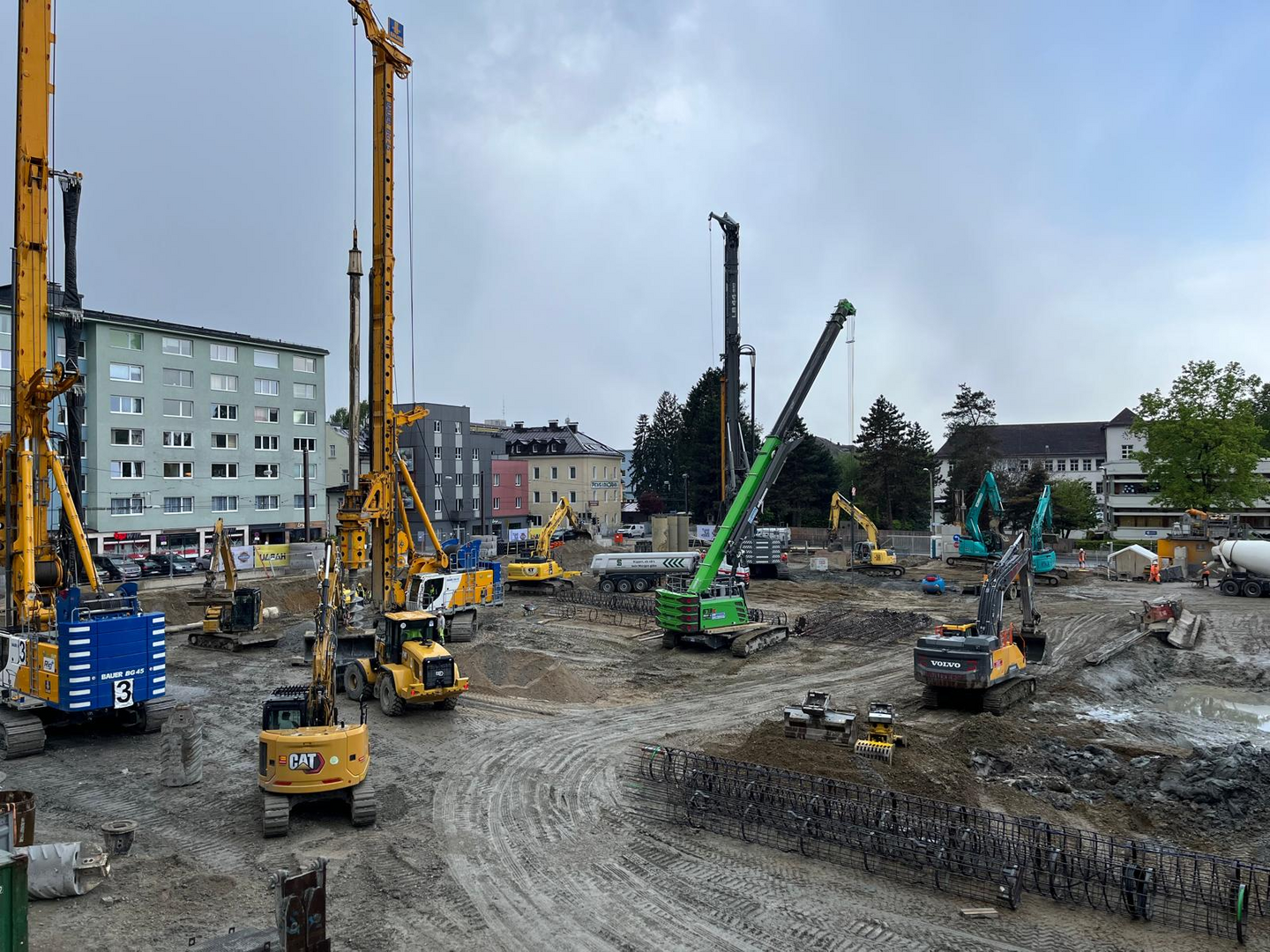 Die Baustelle selbst konnte dann sowohl von einem erhöhten Standpunkt als auch durch den umgebenden Bauzaun gut überblickt bzw. eingesehen werden. Imposant war besonders die Dichte an gleichzeitig durchgeführten Arbeiten. So erfolgte die Herstellung der Bohrpfahlgründung parallel zu den Schlitzwandherstellungen für die zukünftige Baugrubensicherung.