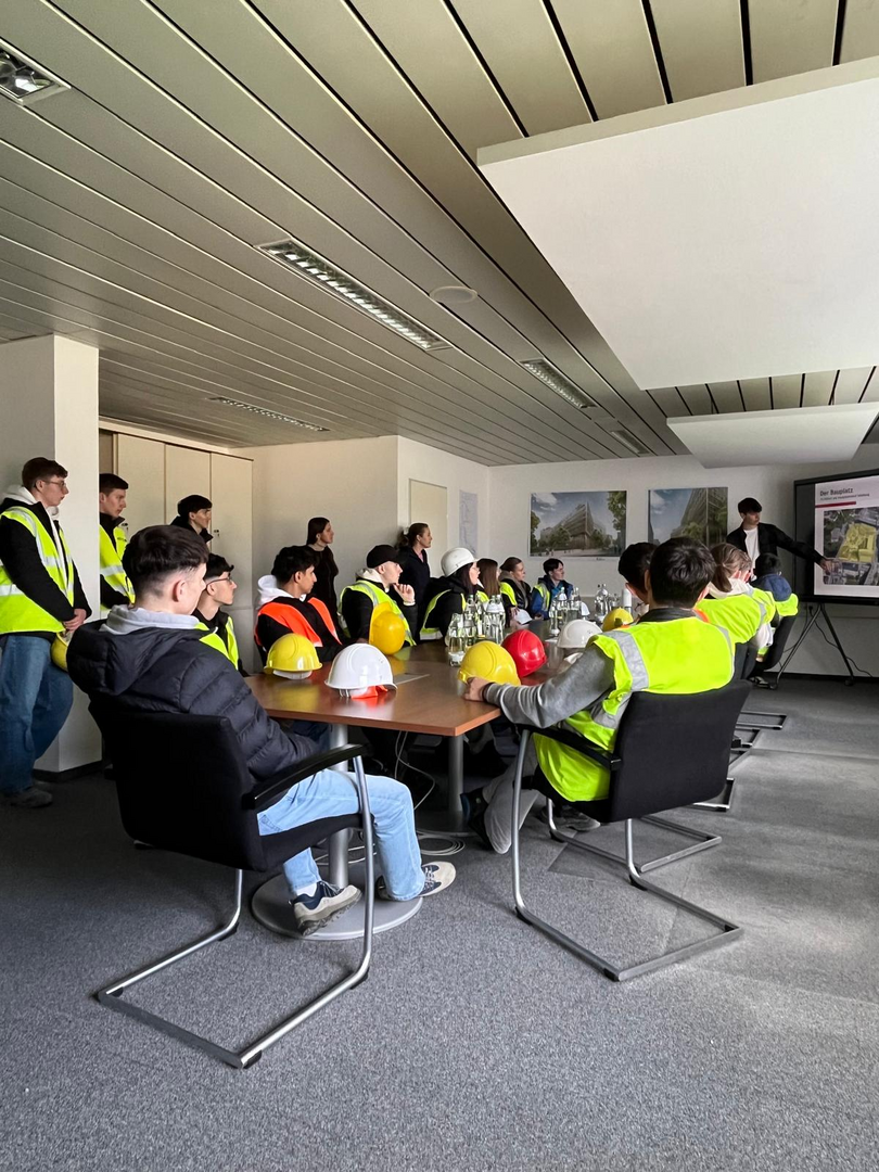Bevor die Klasse das Baustellengelände betrat, erfolgte eine Projektvorstellung. Von besonderem Interesse waren die derzeit durchgeführten Tiefbauarbeiten in Form von Tiefgründungen, wie Pfahl- und Schlitzwandarbeiten. Die Gründung des 9-stöckigen Gebäudes muss bis in Tiefen von 35-40 m erfolgen, um zur tragfähigen Schicht unterhalb des Salzburger Seetons zu gelangen.