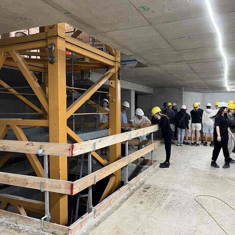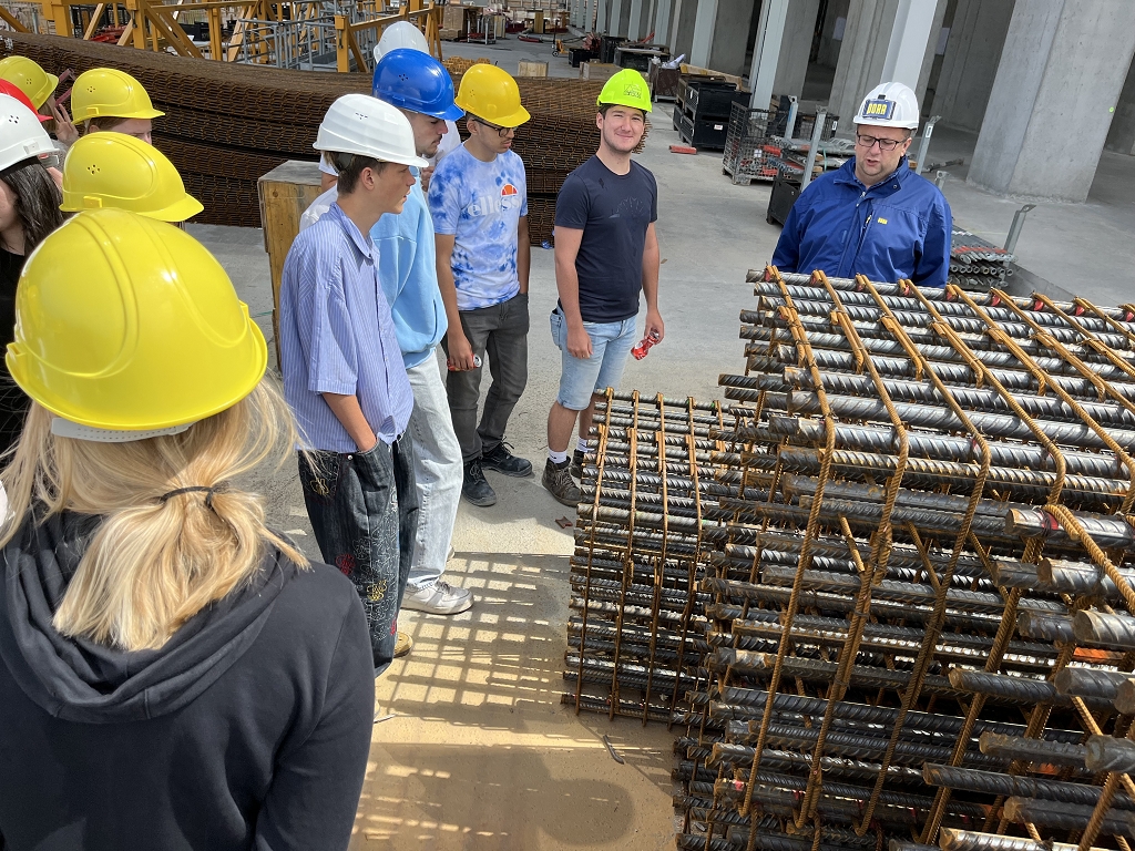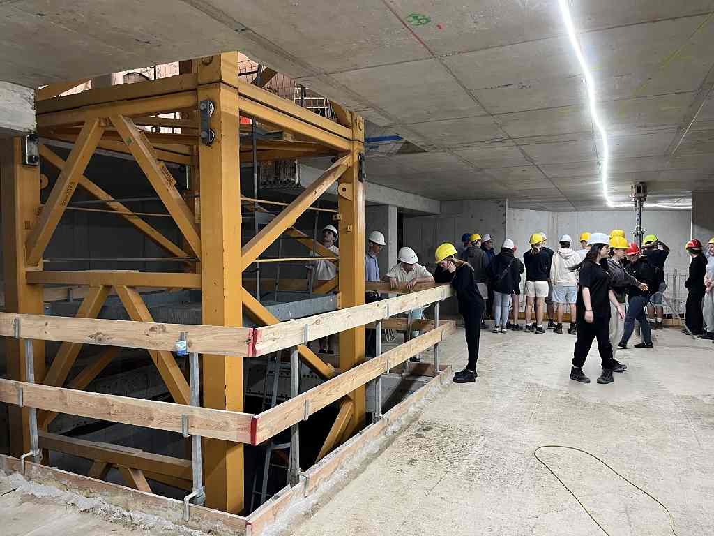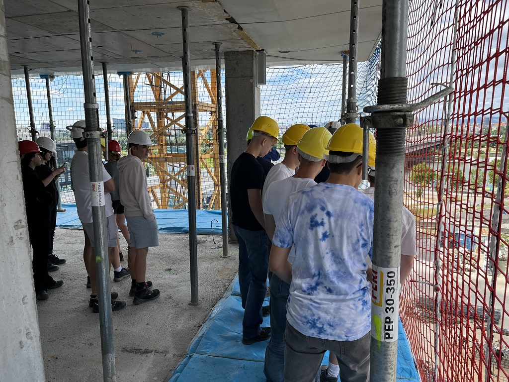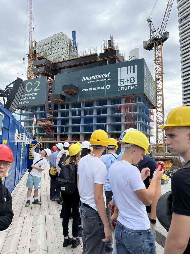 Um 9 Uhr starteten wir unseren Tag von der Jugendherberge und fuhren zur Baustelle auf der Donauinsel. Dort angekommen, bekamen wir als Klasse eine Einführung in das Projekt. Ein 188 Meter hohes Hochhaus wird dort derzeit durch die Firma Porr gebaut. Das Bauwerk aus Stahlbeton hat vier Hauptstützen und pro Stockwerk 32 zusätzliche Stützen. Der Aussteifungskern wird mit Kletterschalungen in die Höhe gezogen. Gearbeitet wird dort im Schutz eines großen umlaufenden Windschildes. Anschließend erhielten wir als ganze Klasse eine spannende Führung durch die Baustelle. Wir erfuhren dabei viele interessante Details über die Konstruktion und die Herausforderungen bei einem Projekt dieser Größe.