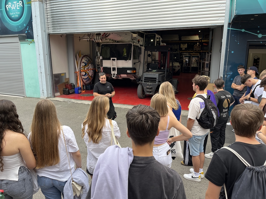 Weiter ging es mit der S- und U-Bahn zum Prater, wo wir die Möglichkeit hatten, Backstage zu gehen. Diesen Einblick ermöglichte uns Koidl Vergnügungsbetriebe, ein Familienunternehmen, das über Generationen derzeit 11 große Fahrgeschäfte am Wiener Prater anbietet. Neben dem Erfahren spannender technischer Details durften wir die Fahrgeschäfte auch auszuprobieren.