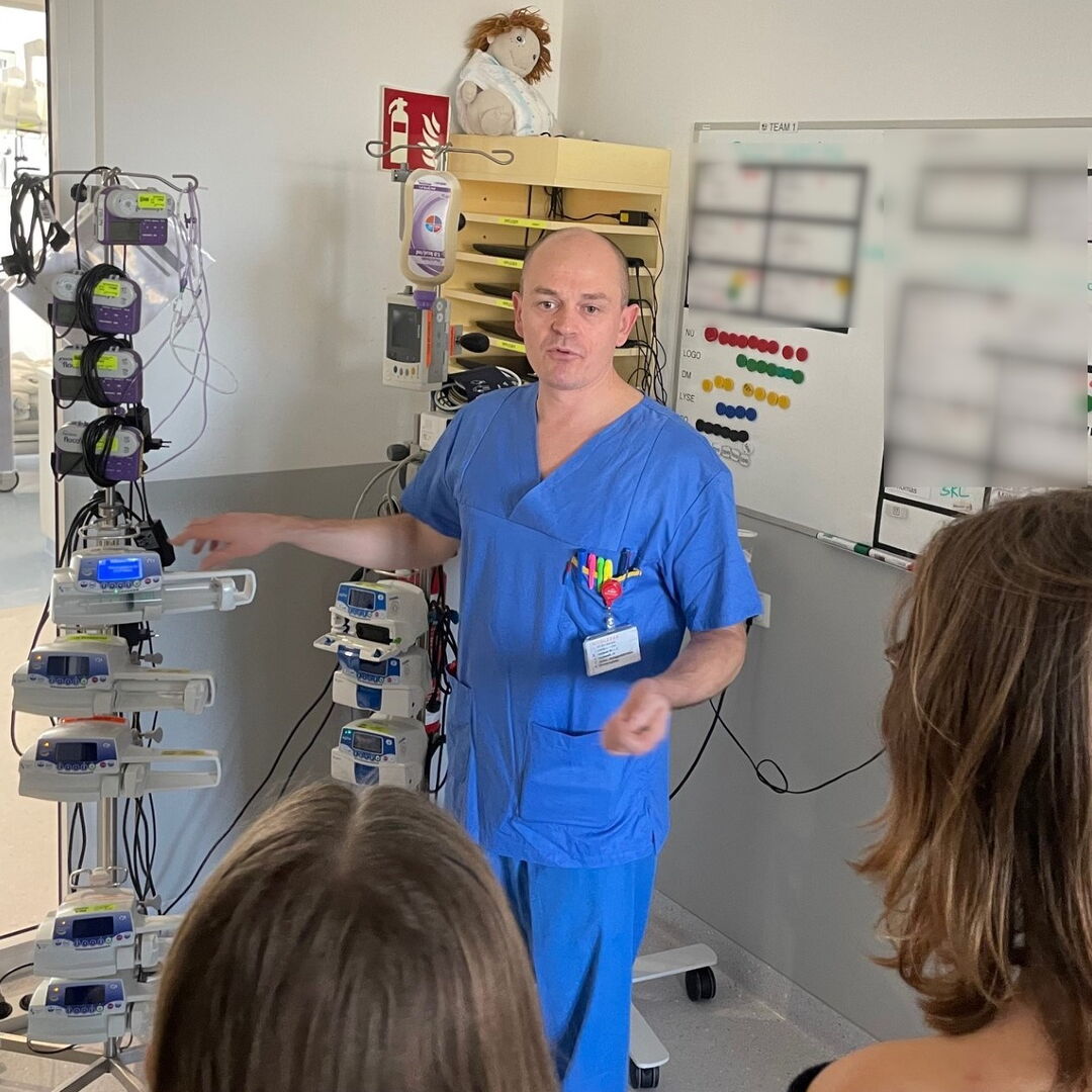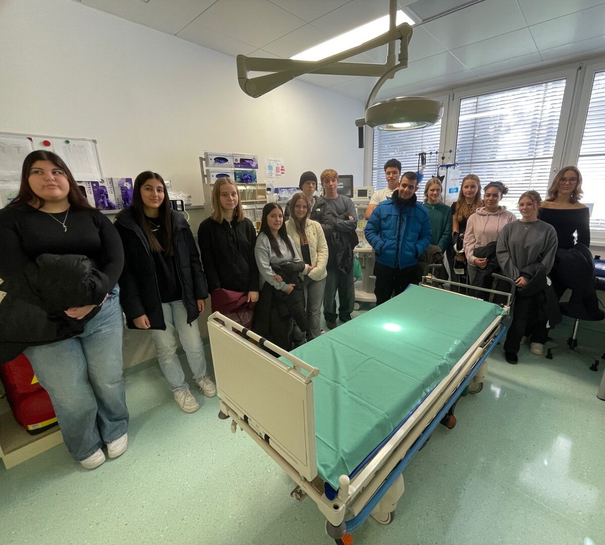 Von den beiden Mitarbeitern der Medizintechnik des Universitätsklinikums wurden wir sehr herzlich empfangen. Eine ehemalige Absolventin der Biomed-Abteilung und ihr Kollege stellten uns ihren sehr umfangreichen Arbeitsbereich vor. Gleich im Anschluss wird unsere Gruppe von den Stationsleitungen der beiden medizinischen Abteilungen neurochirurgische Intensivstation und Schlaganfall-Station erwartet, die uns den komplizierten und teils sehr stressigen Tagesablauf näherbrachten. Vorgestellt wurden uns die vielen an einem einzigen Patienten im Einsatz befindlichen Geräte wie Monitoring, Beatmungsgerät, Infusionsgeräte, Wärmesysteme und viele weitere.