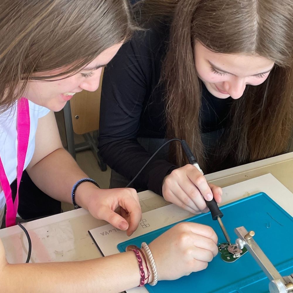 Dabei konnten die interessierten teilnehmenden Mädchen Einblicke in technische Bereiche gewinnen, bei Experimenten mitwirken und den Umgang mit hochkomplexen Medizingeräten auf spielerische Weise ausprobieren. Zum Mitnehmen fertigten sie eine selber gelötete Platine mit UV-Licht-Funktion.