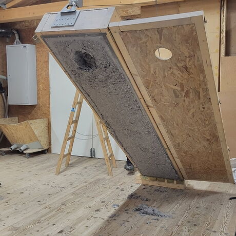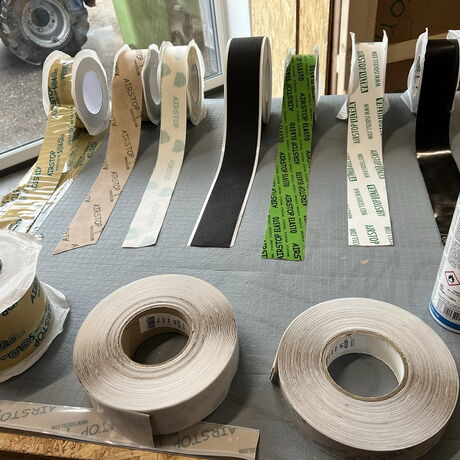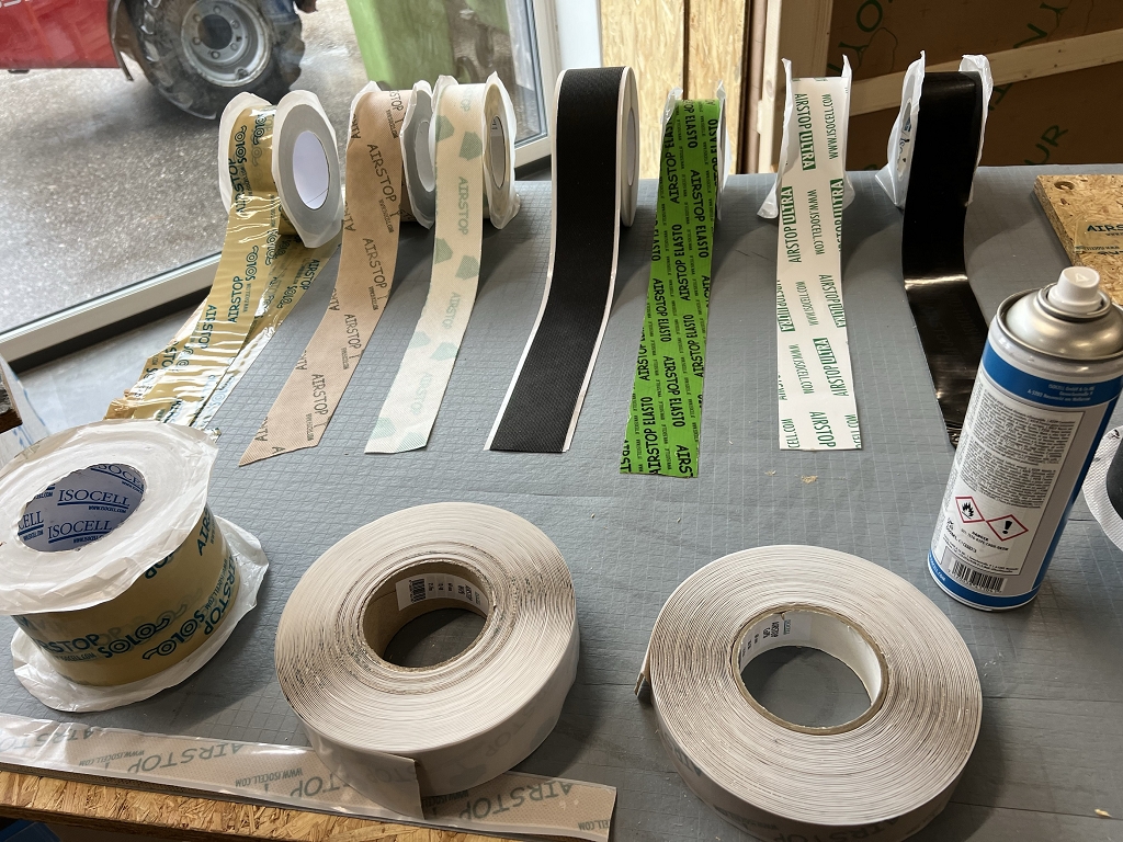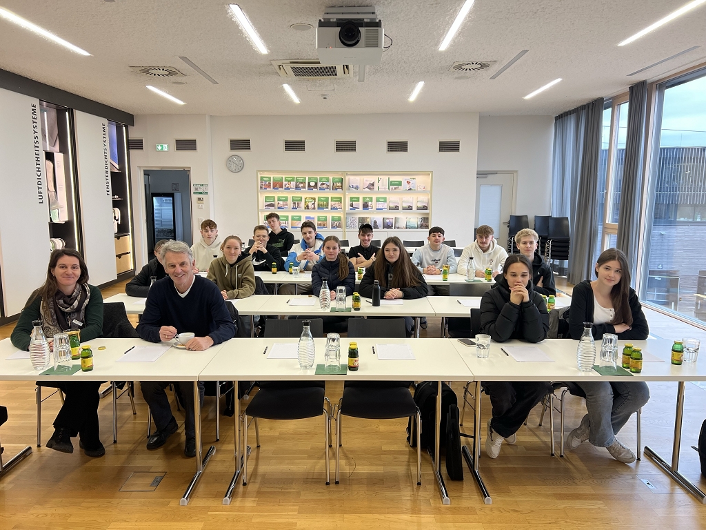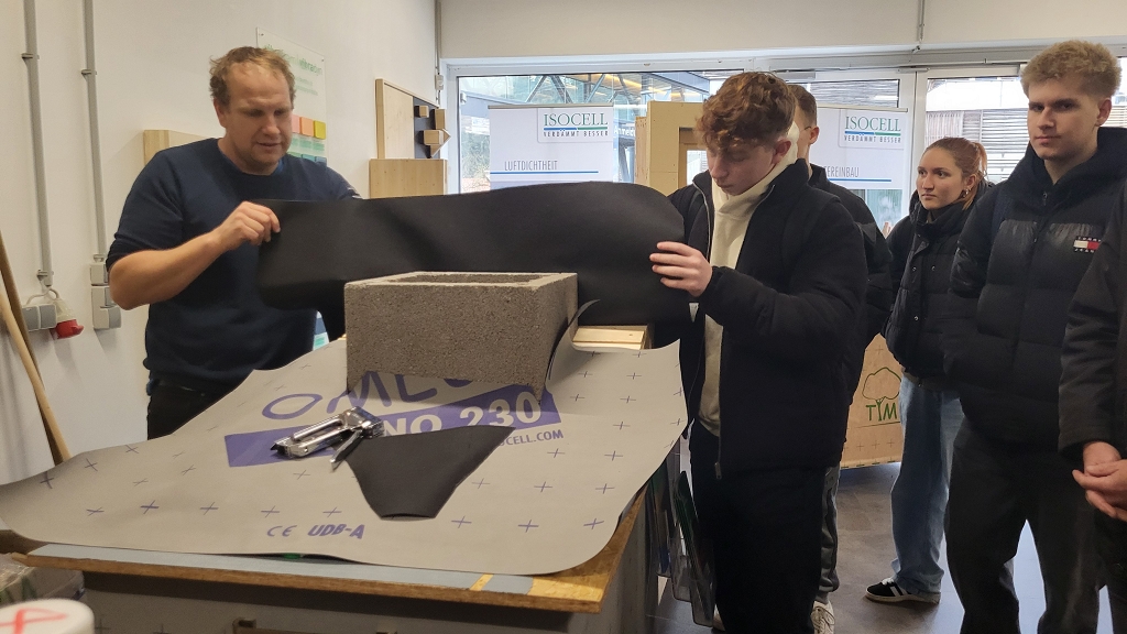 Nach einer Führung durch die Lagerhallen und einem theoretischen Teil über Luftdichtheit im Holzbau konnten die Schüler:innen noch die unterschiedlichen Dampfbremsen, Unterdachbahnen und Abdichtungsbänder im Sinne eines Angreifens und Ausprobierens kennenlernen. Als krönenden Abschluss durften sie schließlich selber versuchen, einen Kamin abzudichten oder eine Fensterbank dicht auszuführen. Gestärkt mit viel praktischem Anwendungswissen und hilfreichen Infobroschüren trat die Klasse die Rückfahrt an.