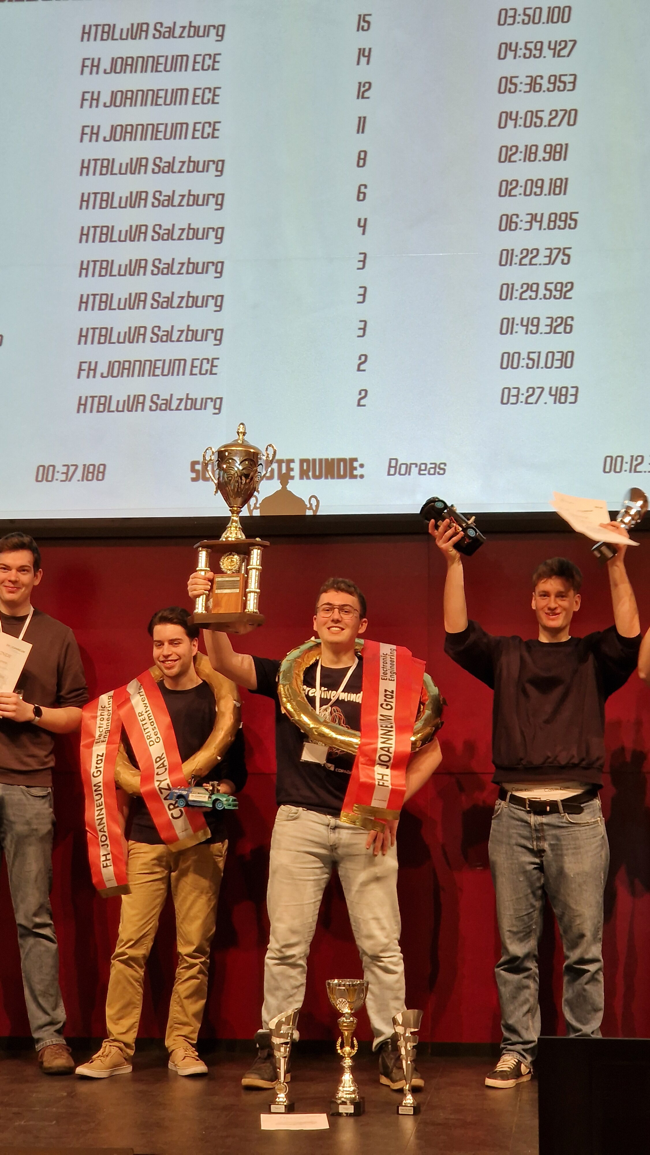 Die hervorragenden Leistungen unserer Schülerinnen und Schüler spiegelten sich auch in den Ergebnissen wider. In der Schülerwertung gingen alle drei Podestplätze an Teams der HTL Salzburg. Besonders hervorzuheben ist der Erfolg von David Eßl, der nicht nur den Gesamtsieg erringen konnte, sondern zusätzlich auch die Spezialwertungen „Schnellste Runde“ und „Schnellster Rennblock“ für sich entschied.