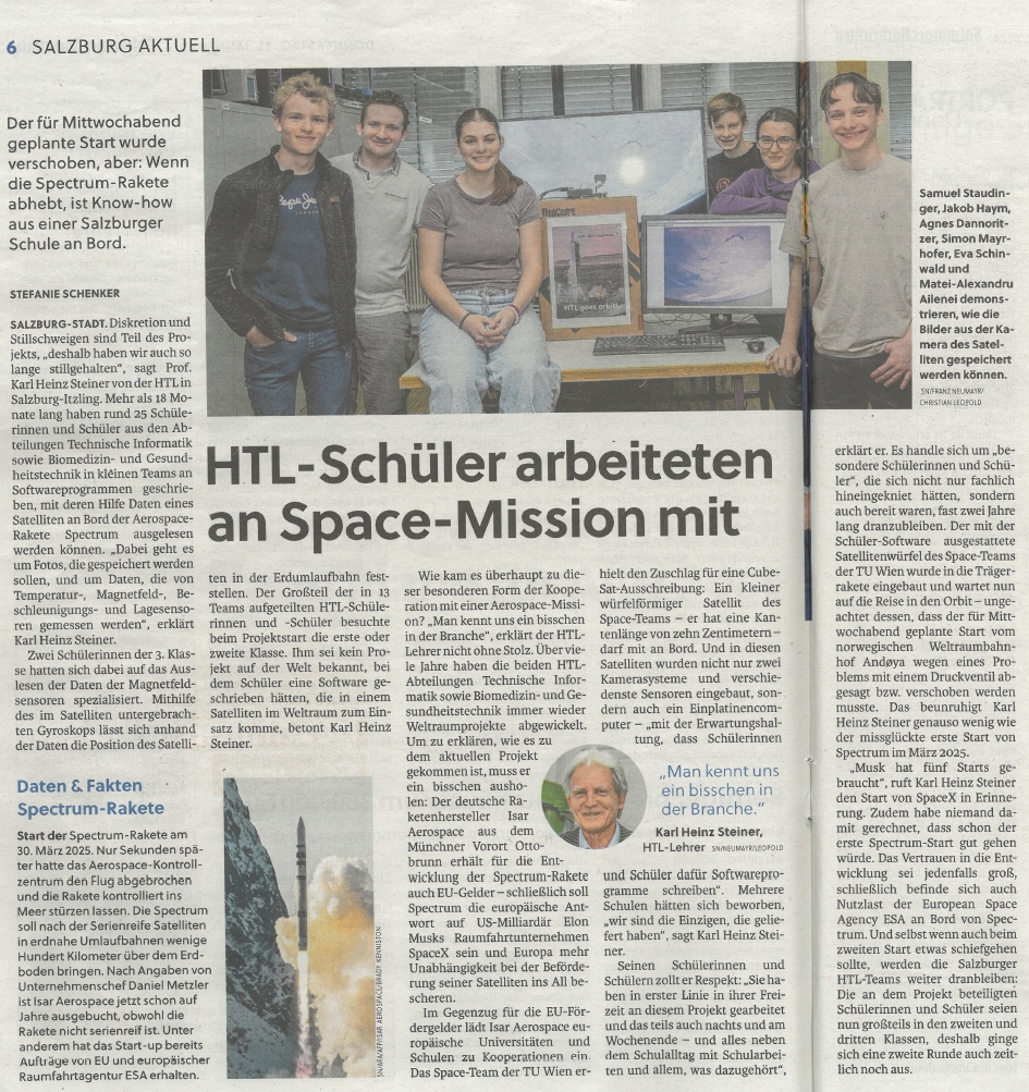 Im Frühling 2024 haben Schülerinnen und Schüler unserer heutigen zweiten und dritten Klassen der Abteilungen für Elektronik und Technische Informatik und Biomedizin- und Gesundheitstechnik begonnen Software für den Space Team Sat 1 des TU Wien Space Teams zu entwickeln. Der erste Startversuch wurde in Folge technischer Probleme mit einem Ventil abgebrochen.