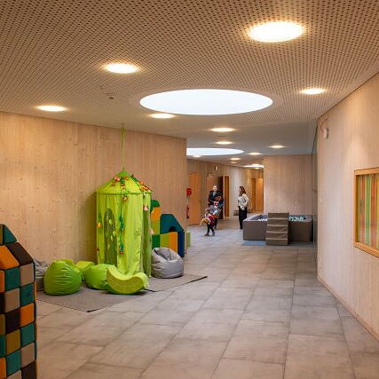 Bei der Besichtigung der beiden Neubauten in massiver Holzbauweise konnten die Schüler:innen der 4C nicht nur städtebaulich überzeugende Entwürfe erleben, sondern Holzbaudetails aus der Nähe erkunden. Architekt DI Georg Huber, Architekt der Kinderstadt Neumarkt und Mitglied des Gestaltungsbeirats, erläuterte das Konzept des Kindergartens, der wie eine kleine Stadt angelegt ist und fünf Gruppen und zwei Kleinkindergruppen beinhaltet. Anhand von Konstruktionsplänen erklärte er den Schüler:innen Aufbauten und Details des Holzbaus, die sie sogleich mit der gebauten Realität vergleichen konnten.