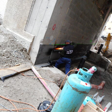 Eingangs wurde im Baubesprechungsraum das Projekt vom Bauleiter in Form einer Power-Point-Präsentation erklärt und ein Überblick geschaffen. Dabei wurden die Polierpläne und der Bauzeitplan erläutert und auf die spezifischen Besonderheiten dieser Baustelle eingegangen. Für die massiven Abbrucharbeiten im Innenhof musste für die Zufahrt des Baggers und den Materialabtransport eine eigene große Zufahrt durch den Bestand hergestellt werden. Besonders hervorzuheben ist auch die anschauliche Darstellung der Fundamentunterfangungen mit Hochdruckinjektionen, die aufgrund des tieferen neuen Kellerniveaus erforderlich waren. Außerdem wurde die Herstellung einer braunen Wanne beschrieben.