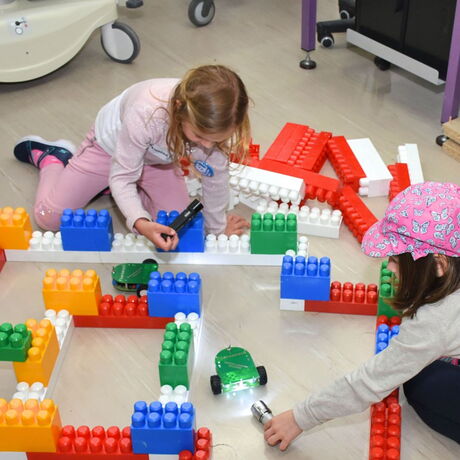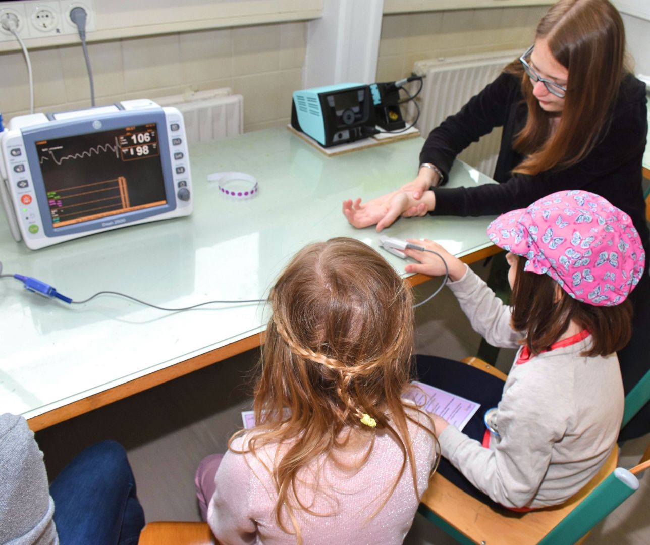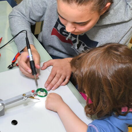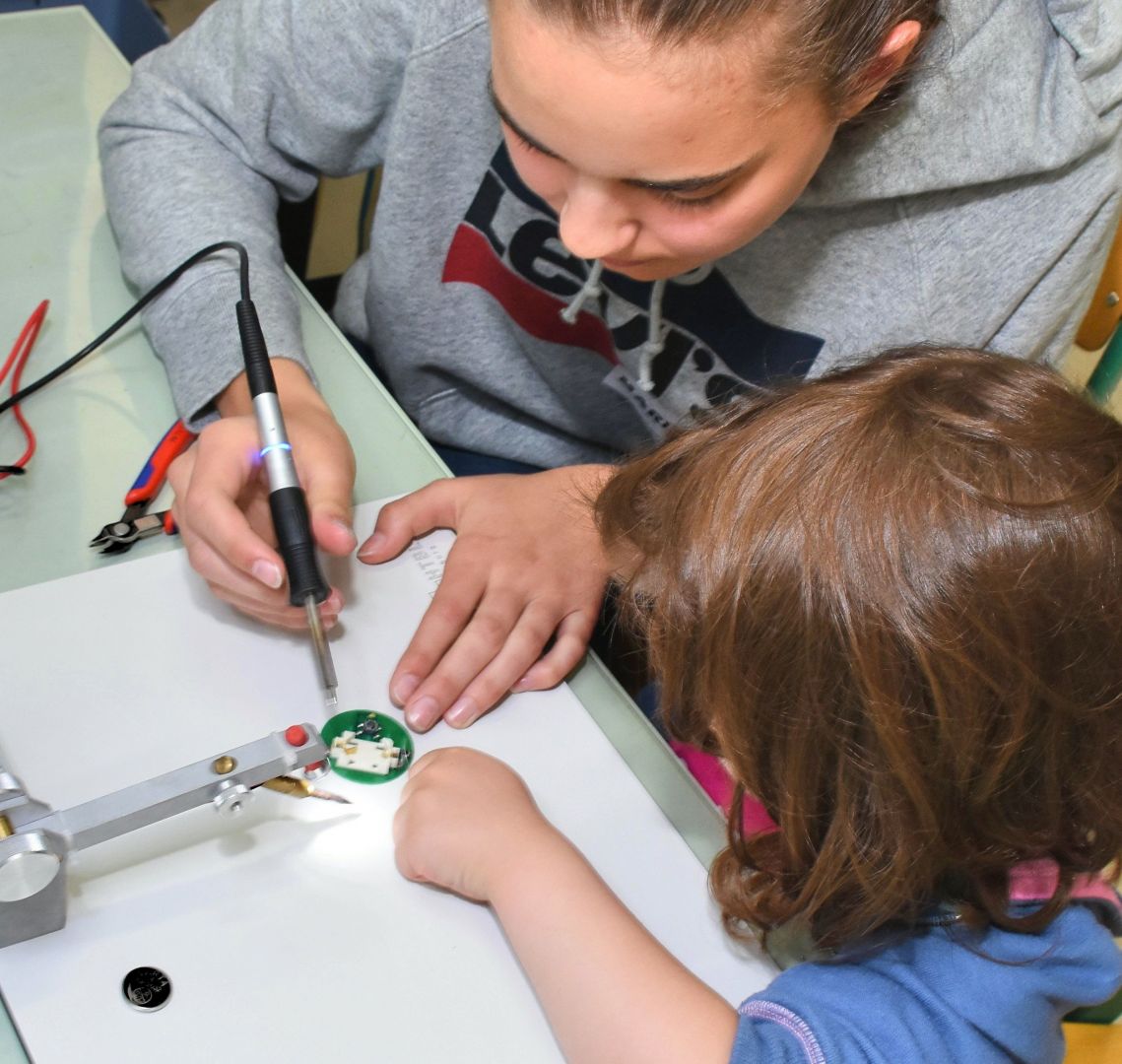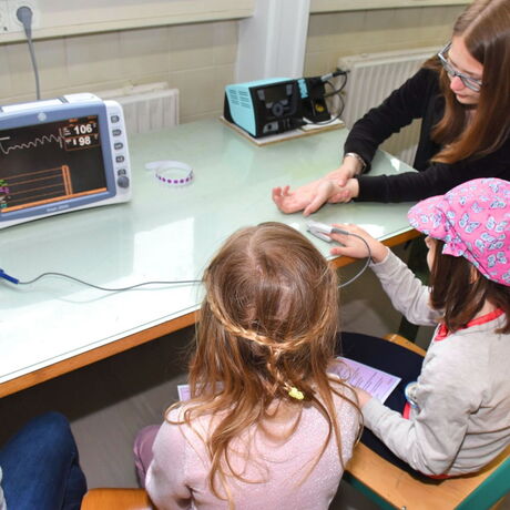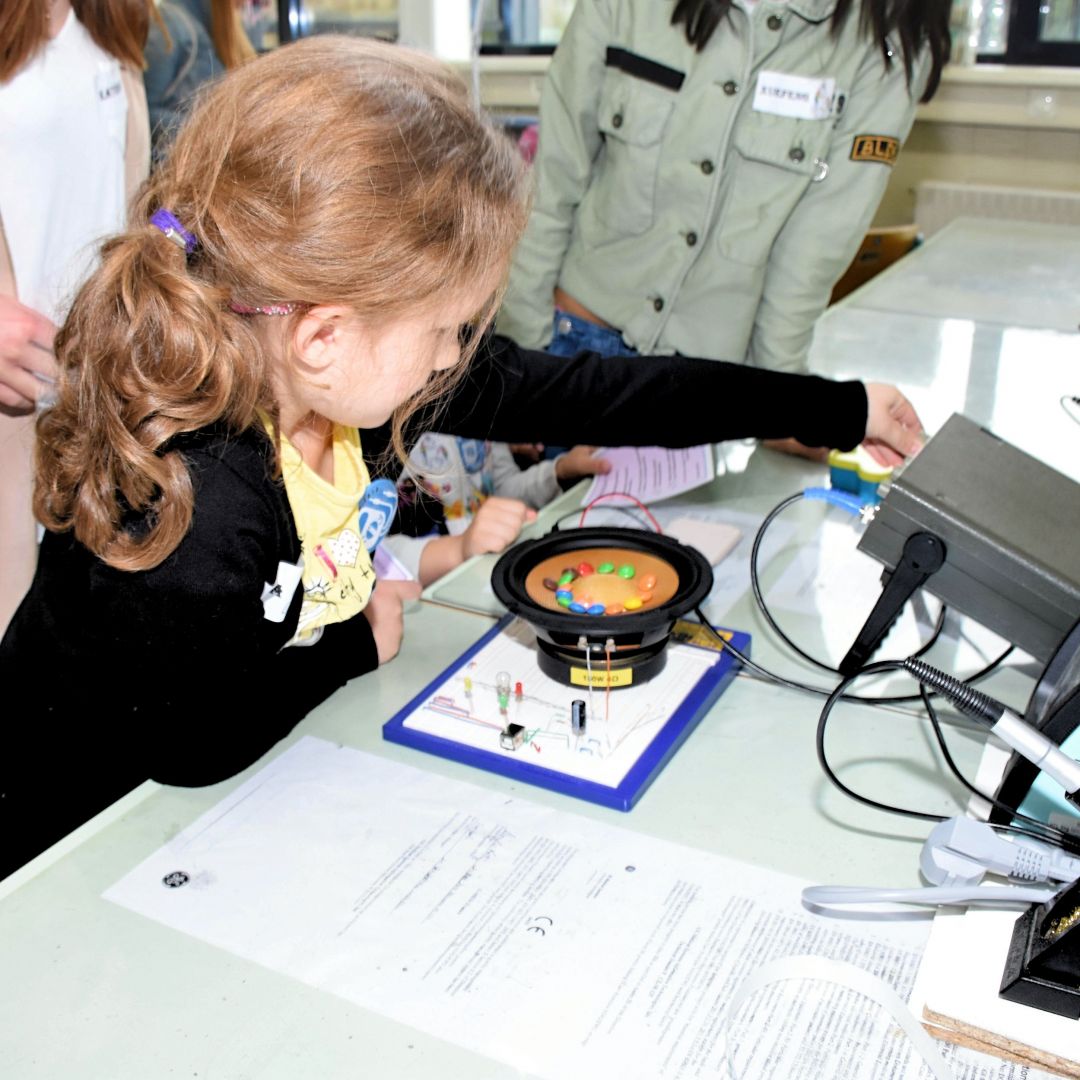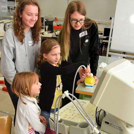 Die tatsächlich hochkomplizierte Technik, die in den Geräten Anwendung findet, wurde von den Kindern spielerisch kennengelernt. Leonie und Katharina entdeckten die Messung ihres eigenen Herzschlages am Monitor, Anna versuchte sich im Einlöten eines Widerstandes auf einer Platine, die sie dann mit nach Hause nehmen durfte. Im Handumdrehen hatten Lena-Sophie und Marie herausgefunden, wie sie mit einer Taschenlampe einen lichtfolgenden Roboter zwischen Lego-Wänden hindurchmanövrieren können. Dass moderne, bildgebende Ultraschalltechnik helfen kann, das Geheimnis, welche Gegenstände in einem Luftballon gefüllt mit Wasser versteckt sind, zu lüften, wurde mit Eifer erfahren. Adelina und Fee mussten hier nicht mehr rätseln, das verborgene Spielzeugmännchen war am Bildschirm sofort erkennbar. An einer weiteren Station konnten zwei Schülerinnen der 2AHBG Katharina begeistern, wie durch einen Lautsprecher elektrische Schwingungen hörbar und sichtbar gemacht werden können.