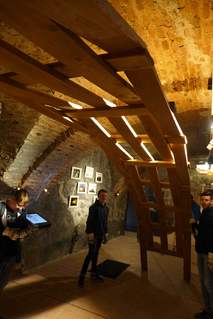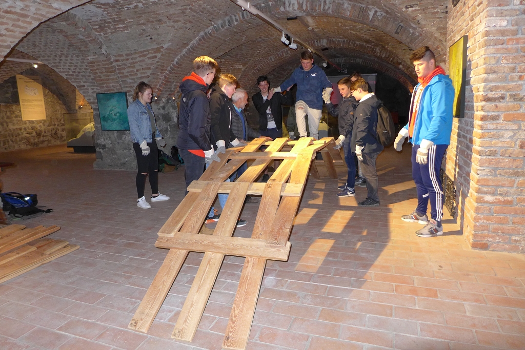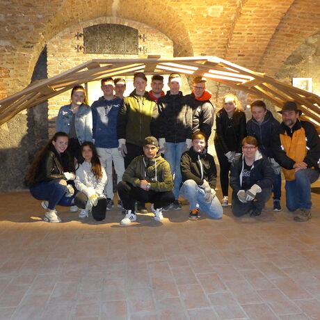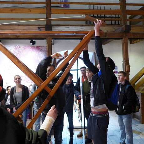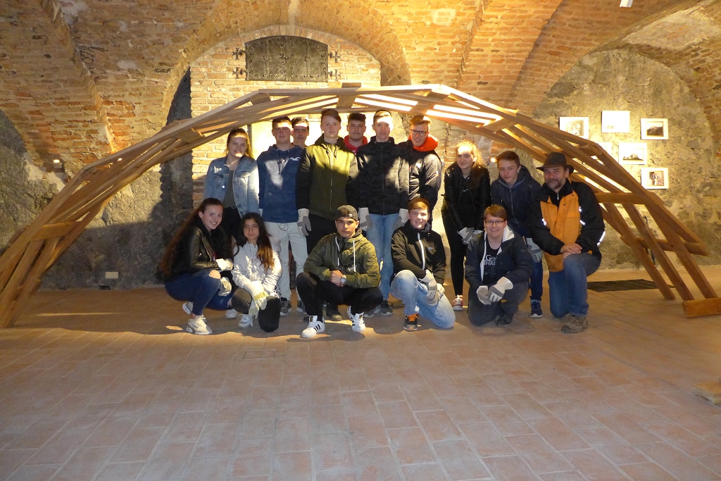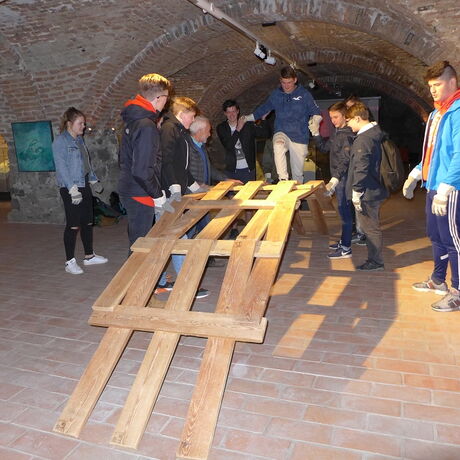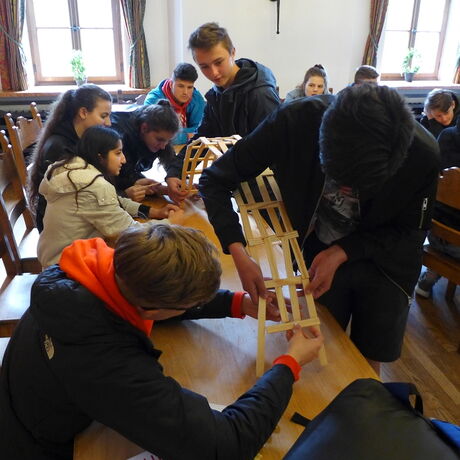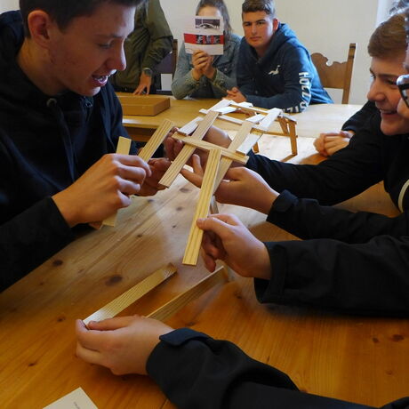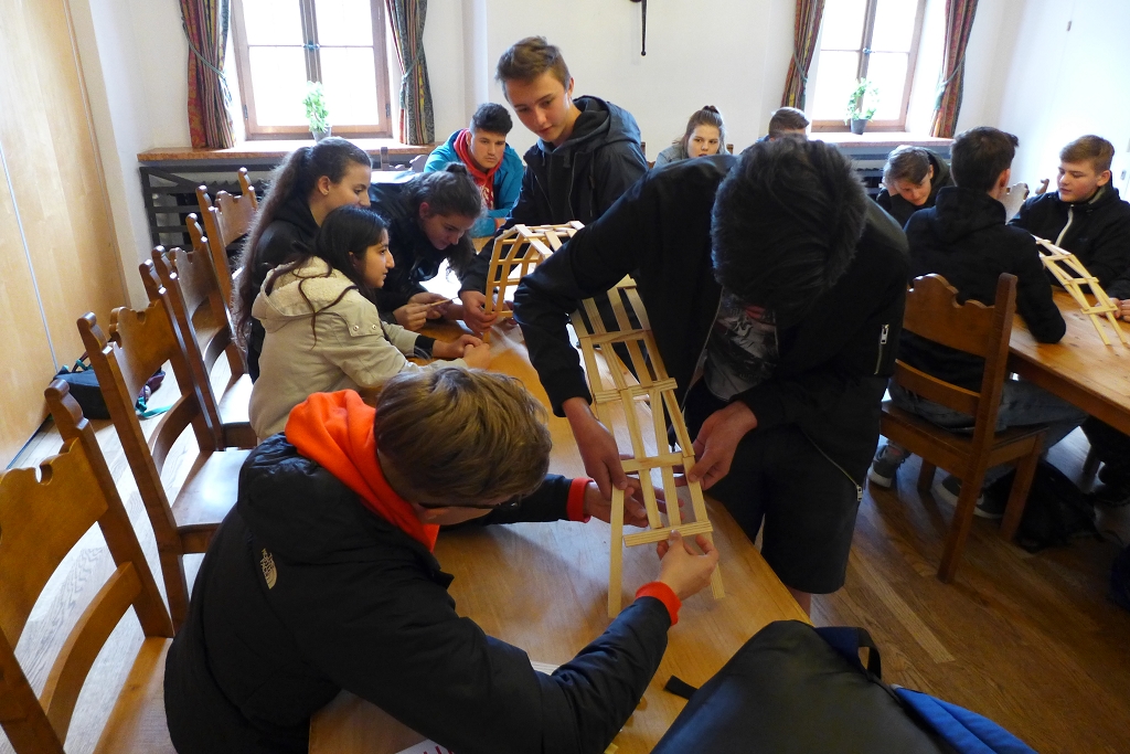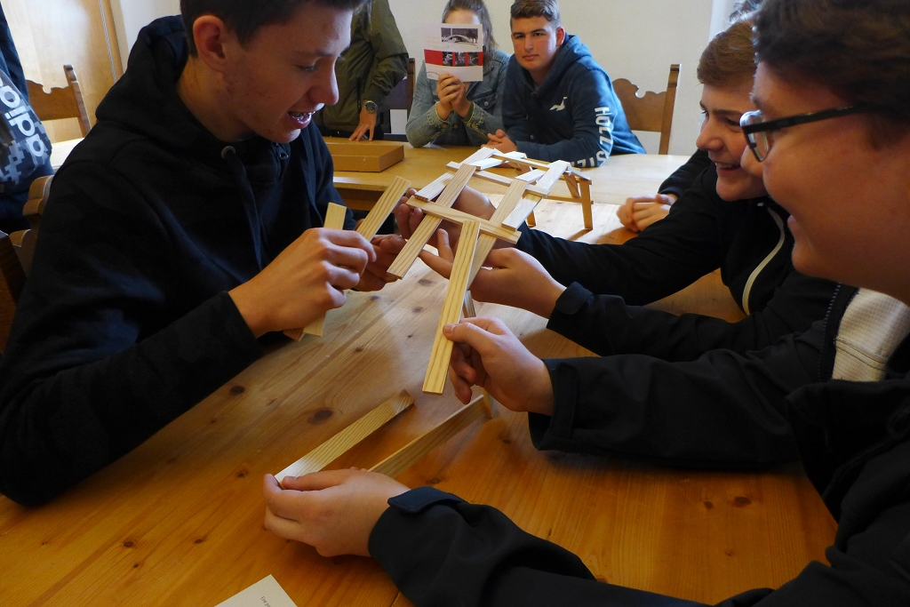 Nach dem Mittagessen besuchten sie den Brückenbauworkshop unter der Leitung von Dr. Wolfgang Richter vom Salzburger Verein ARCHITEKTUR, TECHNIK und SCHULE. Die Klasse wurde in zwei Gruppen geteilt: Eine Gruppe beschäftigte sich mit einem vorgefertigten Modellsatz, während die andere 120cm-Bretter verwendete, um eine große Brücke zu bauen. Hierbei lernten sie eine Bauweise ohne jegliche Verbundmittel wie Nägel oder Schrauben kennen. Dabei war Teamwork gefragt. Es gelang sogar, eine Brücke bis auf Deckenhöhe zu errichten.