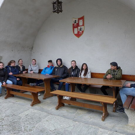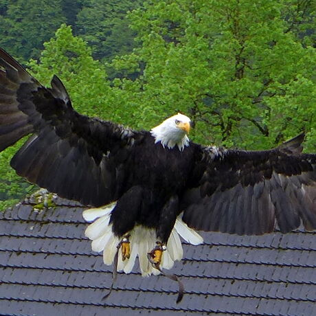 Der nächste Programmpunkt war die Greifvogelschau auf dem Gelände der Burg. Aufgrund des stürmischen Wetters durften nur die erfahrensten Tiere fliegen: Ein Weißkopfseeadler, ein Kaiseradler und ein Sibirischer Riesenseeadler nützten den Wind und glitten elegant durch die Lüfte.