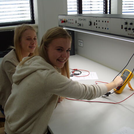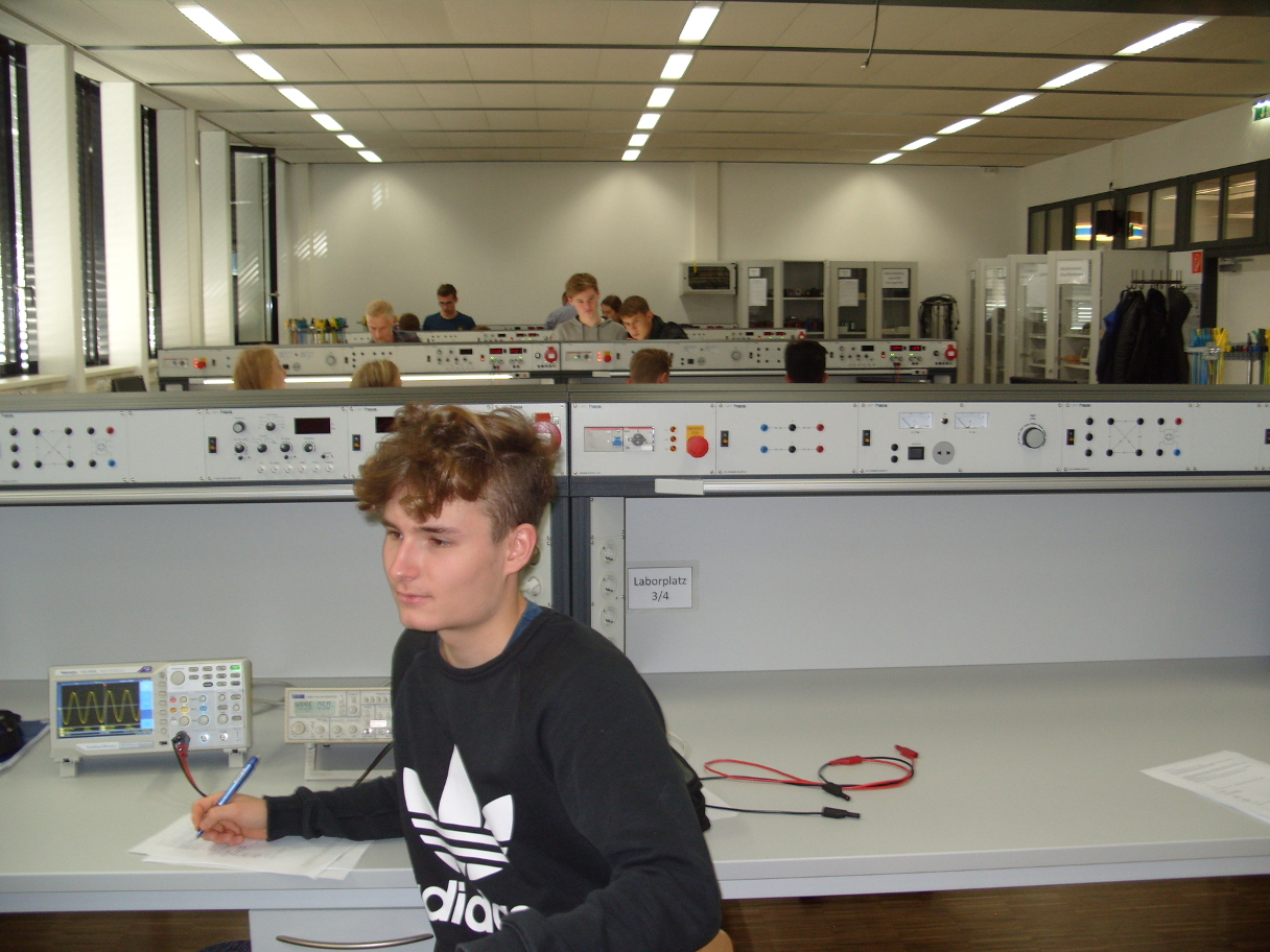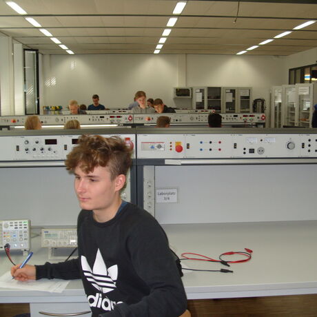 In den Übungen in diesem Raum bearbeiten die Schülerinnen und Schüler der dritten Klassen in Zweierteams in Messungen an Schaltungsaufbauten in verschiedenen Anforderungsstufen die wesentlichen Inhalte des elektrotechnischen Grundlagenstoffes der ersten Klassen.