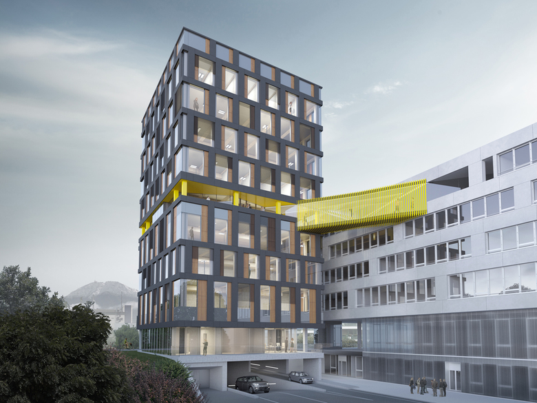 Im Bereich des Salzburger Bahnhofviertels wird gerade das bestehende Gebäude der Salzburger Gebietskrankenkasse erweitert. Nach den Plänen des Architekurbüros "kofler architects" entsteht ein zehnstöckiges Bauwerk direkt über den Auffahrtsrampen einer bestehenden Tiefgarage in innovativer Holz-Hybridbauweise.