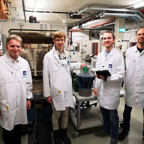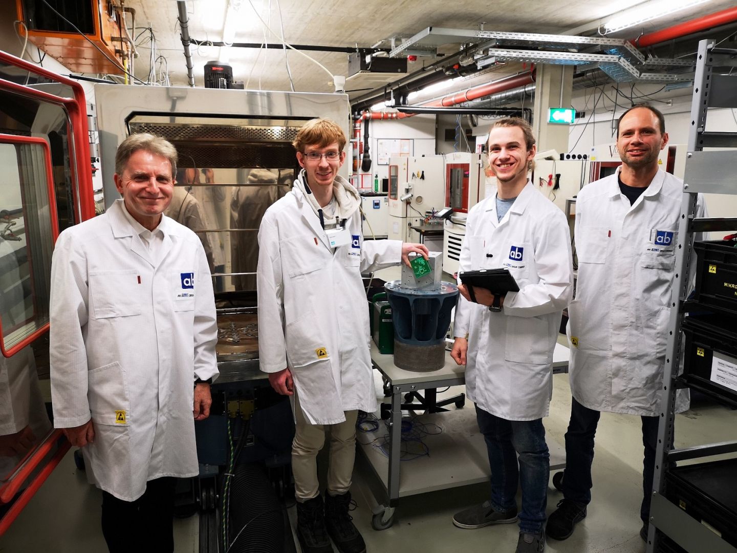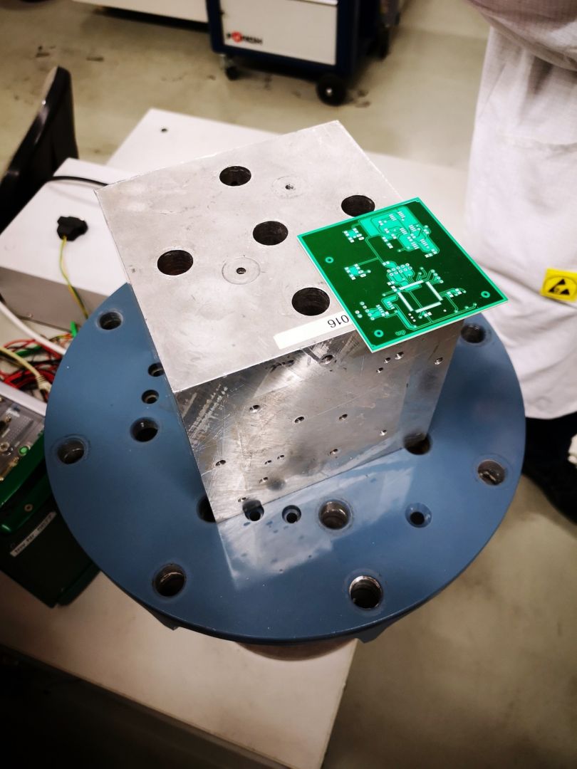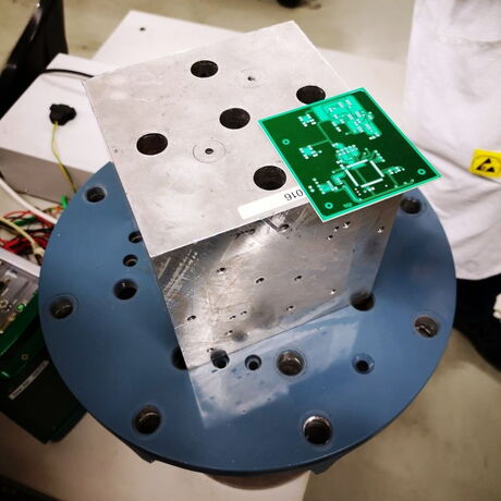 Die beiden letzten Bilder zeigen das Team bei einer Besprechung bezüglich Details der Tests am Rütteltisch. Damit werden die mechanischen Belastungen auf die bestückte Platine bei einem Raketenstart simuliert.
