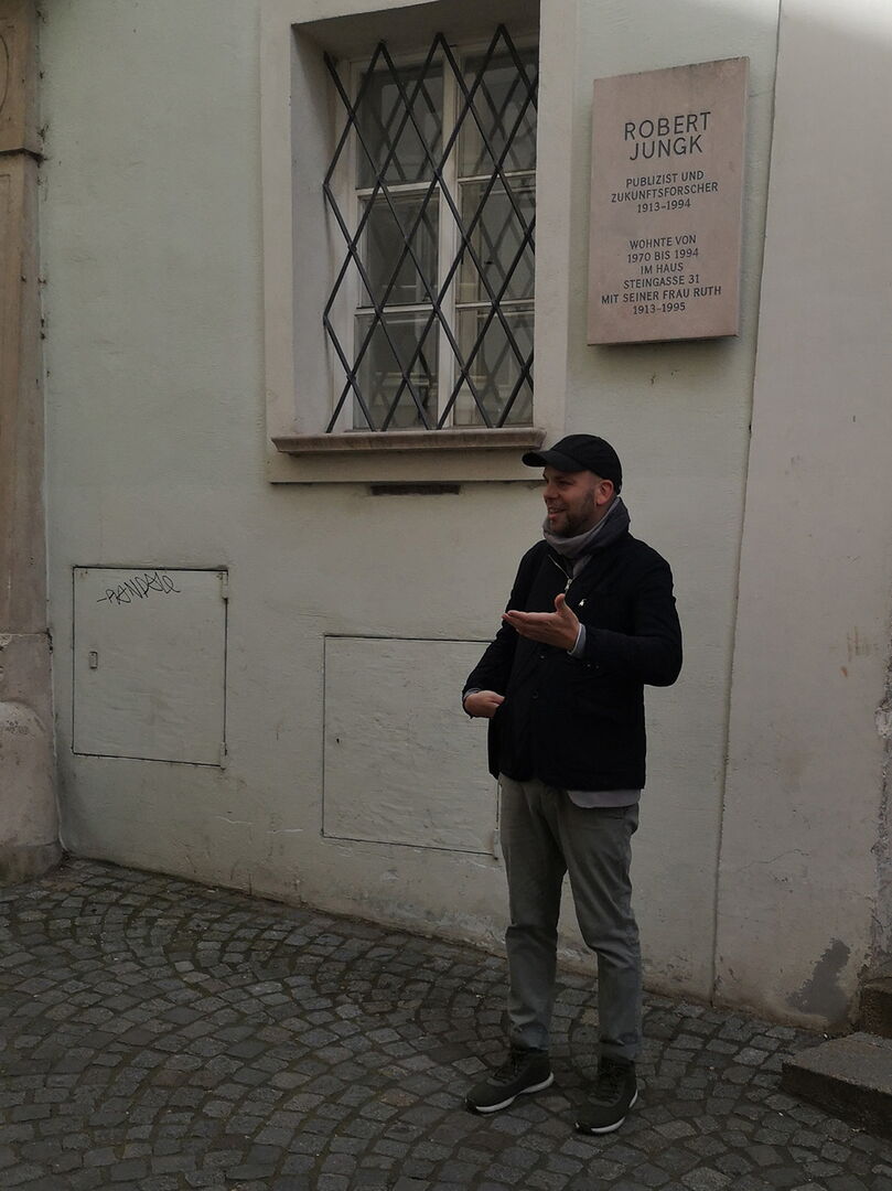 Das Projekt entstand in Zusammenarbeit mit dem Wissenschaftler Martin Kudla von der Universität Frankfurt, der den SchülerInnen zum Abschluss einen großartigen "Robert-Jungk-Tag" in der Stadt Salzburg ermöglichte: Sie schlenderten über das Wohnhaus und die ehemalige Robert-Jungk-Bibliothek zum Literaturarchiv, wo sie Einblicke in Originaldokumente erhielten. Außerdem konnten sie mit Peter Stephan Jungk in Kleingruppen zoomen.